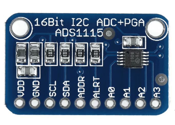 The ADS1115 chip is fairly small so it comes on a breakout board with ferrites to keep the AVDD and AGND quiet. Interfacing is done via I2C. The address can be changed to one of four options so you can have up to 4 ADS1115 connections on a single 2-wire I2C bus for 16 single-end inputs.